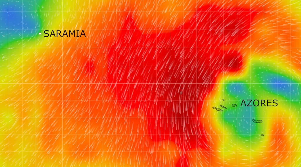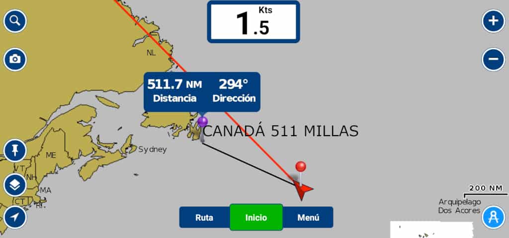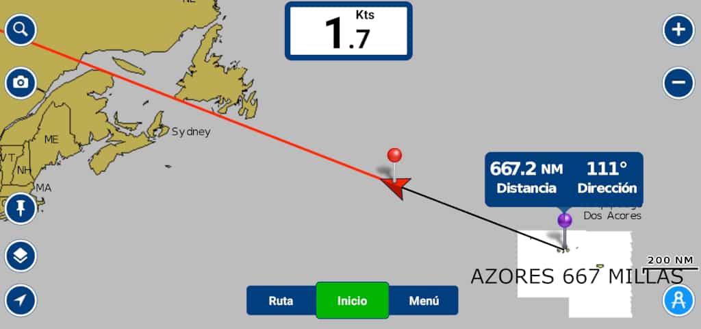 Después de estos días de encalmada la previsión pintaba muy bien. Una nueva borrasca que venia por el oeste nos empujaría hacia arriba para llegar ciñendo hasta las Azores. Pero a los dos días de subirnos en la autopista que nos llevaría hasta las azores la previsión empezó a cambiar y por el este nos venía una baja presión que nos iba a traer vientos muy fuertes del norte. En esos momentos todavía teníamos bastante fresco el recuerdo de las rachas de 50 nudos de la anterior borrasca que vino del norte así que decidimos seguir la estrategia mas conservadora y mas dura mentalmente, navegar sin rumbo y tratar de hacer tiempo entre las latitudes 42 y 43 y esperar a que la borrasca pasara. Fueron 3 días de navegar lo más despacio posible, de sacar la trinqueta y subir norte a la menor velocidad posible para no ir demasiado arriba, aun así llegamos a estar mas cerca de Terra Nova en Canada que de Horta en las Azores. Fueron días agotadores de mucho frio en el que las guardias las hacíamos con el barco cerrado y nosotros controlando la intensidad del viento y el AIS acostados en nuestro camarote y con la tablet de Jota.