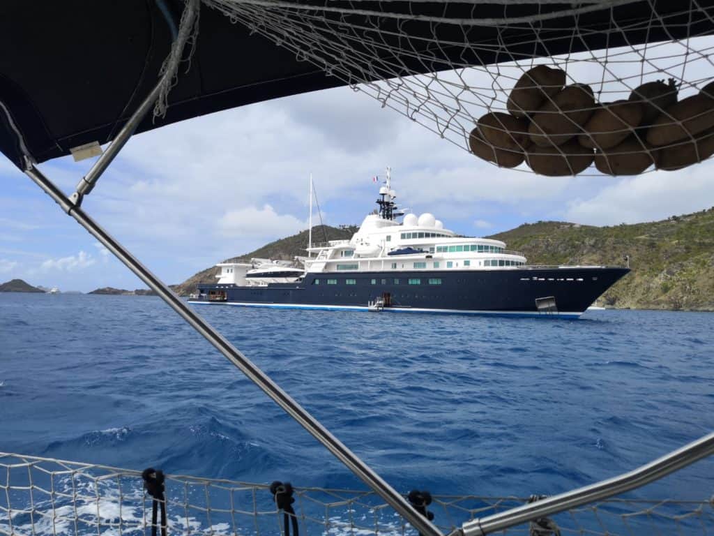 Mega Yate fondeado en Gustavia.Tiendas de lujo en St. Barth.