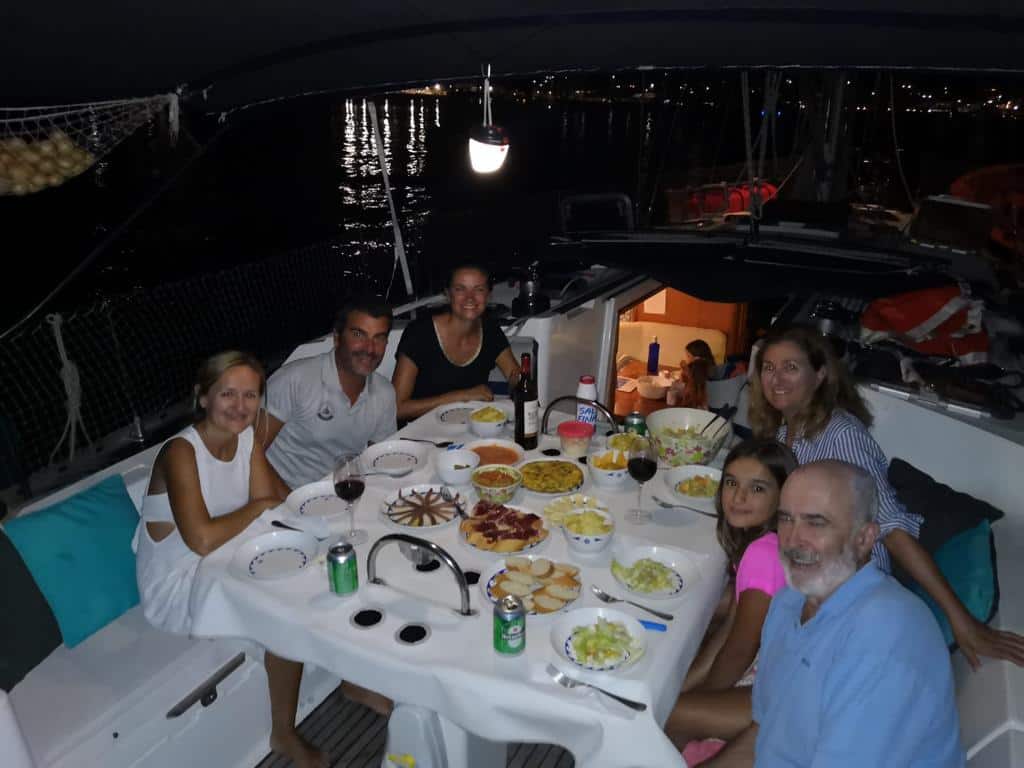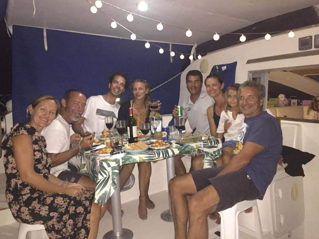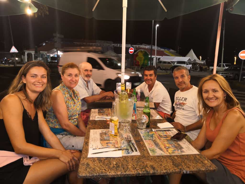 Cena con la tripulación del Luzula, Armando y Natalia y del Zingay Javi, Pilar, Anne y Eva cenando en el Saramia.
