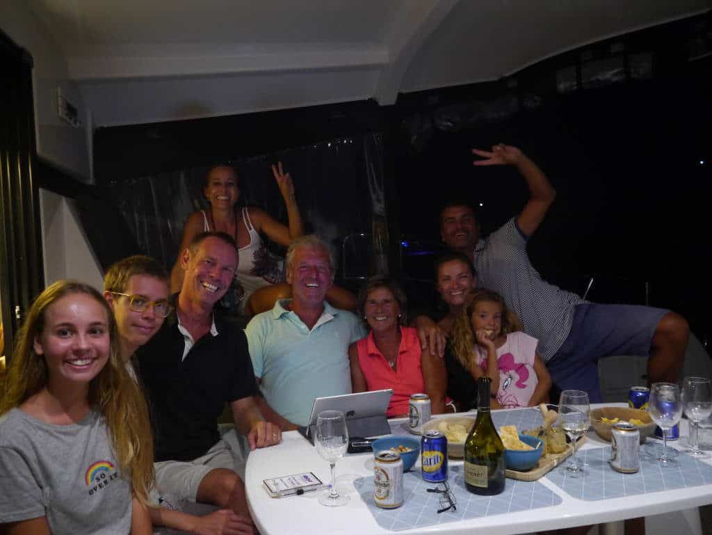 Pero antes de que llegaran tuvimos la suerte de coincidir la noche anterior con los amigos del velero Phi. Gracias a la ARC nos vamos encontrando con amigos y conocidos en muchos fondeos. Esta vez fueron los holandeses del Phi, Jurgen y Mirjam, que junto a sus hijas Kiki y Noor nos invitaron a tomar unas cervezas en su velero. Maria, se encargo de preparar un maravilloso pastel!! 2 días después repetimos y fuimos nosotros los que les invitamos a unas cervezas en el Sarámia.