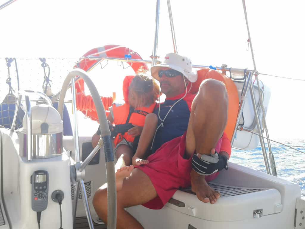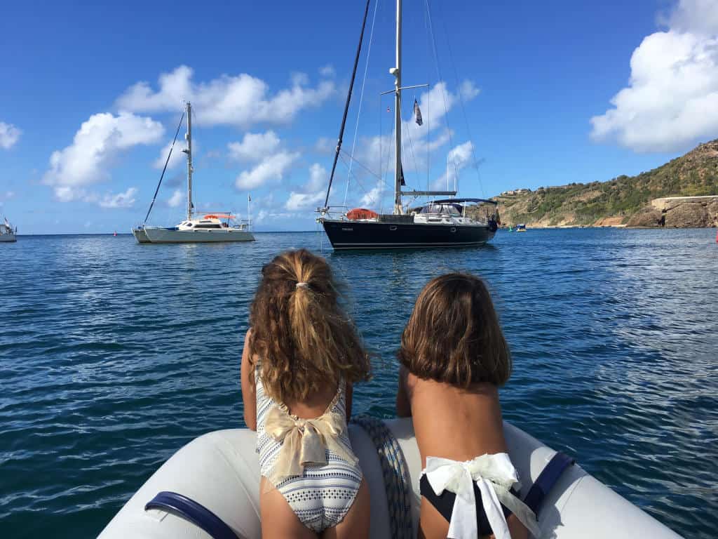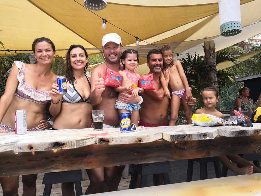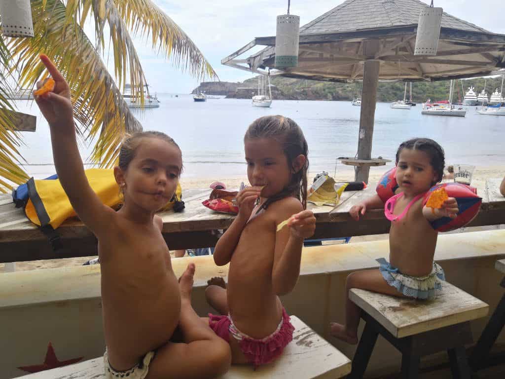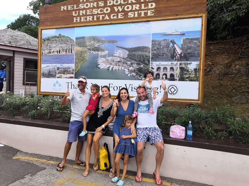 Ivan y yo en la popa del Saramia.Las peques en la playa de English Harbour.Chiringuito Time en English Harbour.Sara, Mia y Carmen.Familia Aliaga-Ferri y Mora-Conejero.