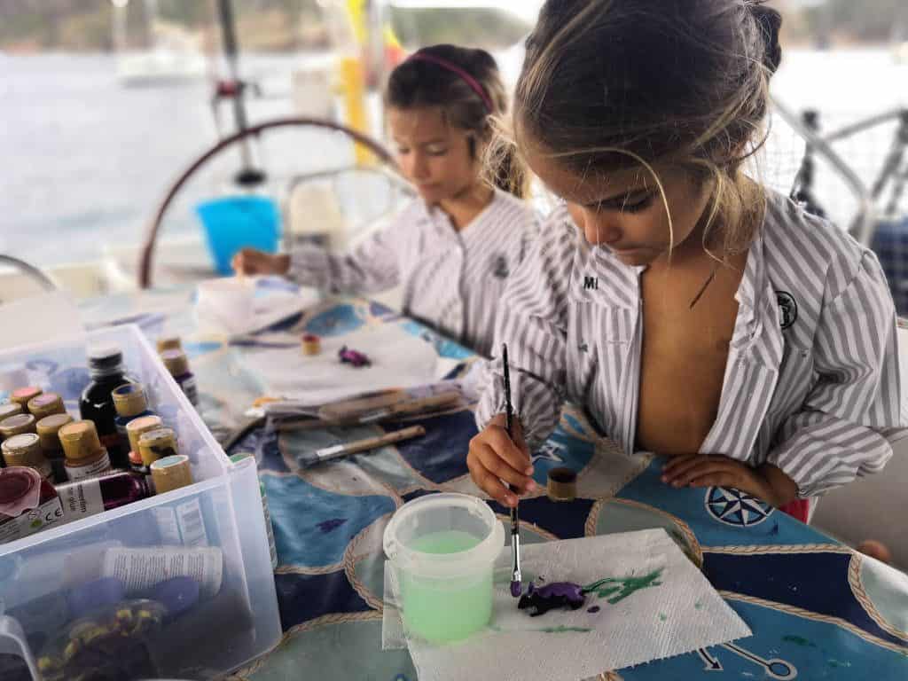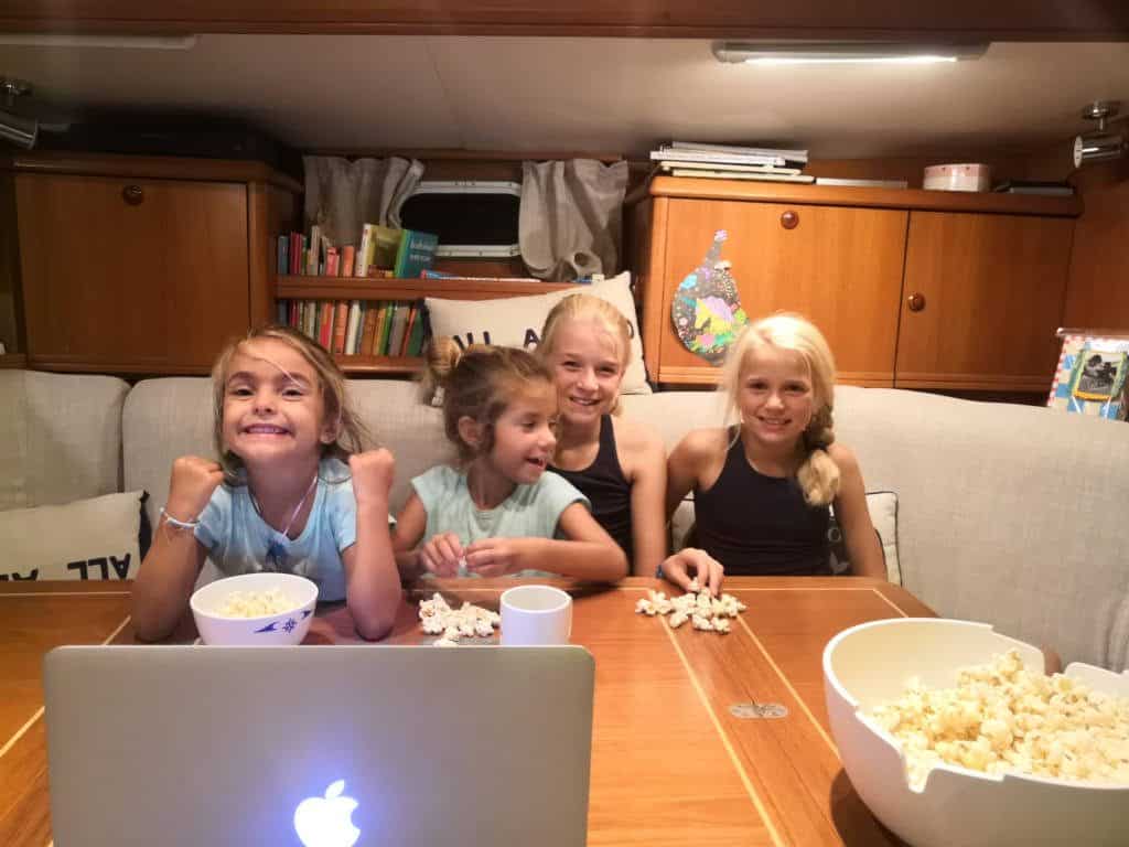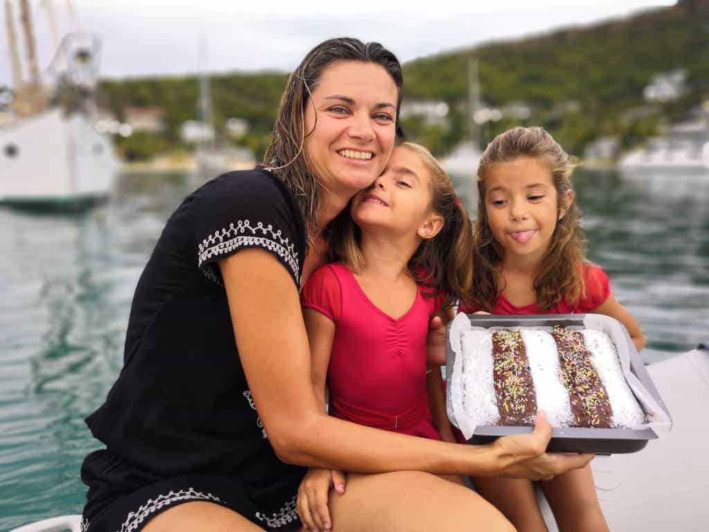 Nos vamos de visita al velero Phi con un maravilloso pastel.Sara, Mia, Kiki & Noor en el velero Saramia.