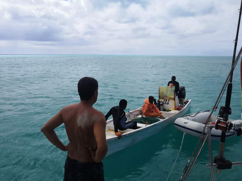 Negociando con los pescadores locales. Barbuda.Maria con su cena. Low Bay. Barbuda.