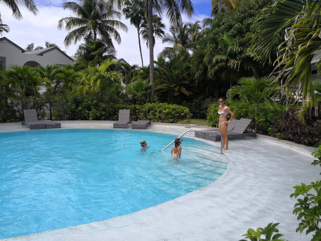 El hotel es un hotelazo de 5 estrellas de super lujo que tiene su propio amarre para barcos. Llegamos por la mañana y fuimos decididos a la piscina sin que nadie nos dijera nada. Allí pasamos la mañana y la tarde. Desde Guadalupe que no nos bañamos en una piscina de agua dulce! Todo un lujazo.