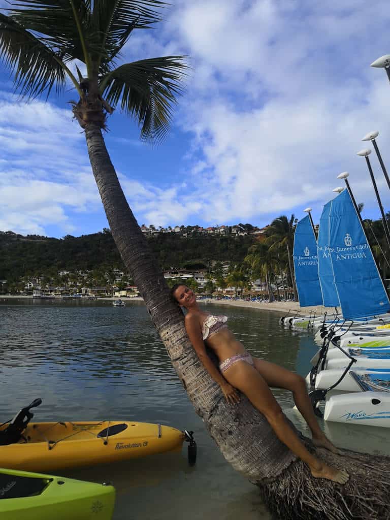 Maria doblando una palmera en el Club St James en Marigon Bay.