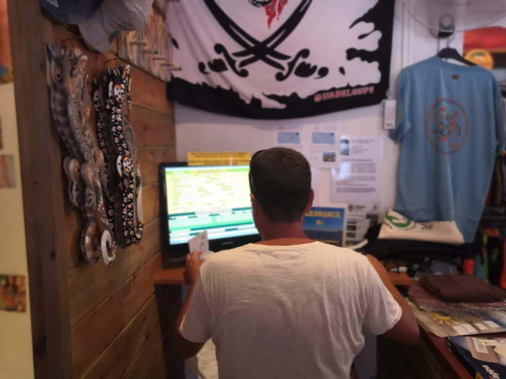 El 29 de Enero pusimos rumbo de nuevo a Deshaies, la previsión para el día siguiente era buena y decidimos realizar el zarpe en Deshaies para el día siguiente. Esta vez el zarpe lo realizamos en una tienda de ropa de la calle principal. Sorprende que el zarpe se realice en bares o tiendas y te ponga el sello en el documento el propietario de la tienda. Es realmente cómodo y no tiene nada que ver con el resto de países del caribe donde debes acudir a las oficinas del gobierno y tratar con policías para todo este tipo de tramites.