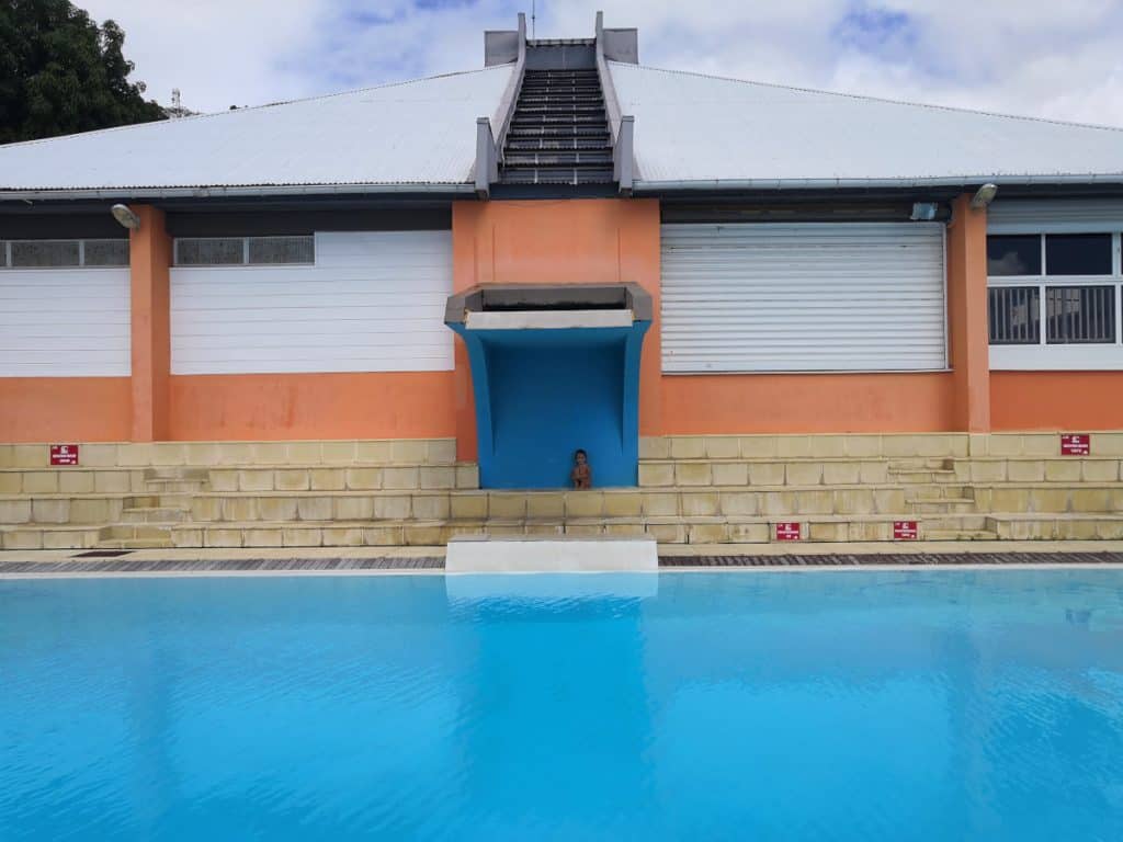 Después de pasar 4 días fantásticos en Les Saintes, el día 20 pusimos rumbo norte por el oeste de Guadalupe. A la hora de comer llegamos a una pequeña bahía donde comimos y bajamos al pueblo a pasear. Al pasar por delante del club náutico de la ciudad, a Maria se le ocurrió entrar a curiosear. En ese momento se nos acerco la secretaria del club a preguntarnos que hacíamos allí. Al ver que tenían una piscina le preguntamos si nos dejaba bañarnos y su respuesta fue que no deberíamos, pero como ese día no había nadie podíamos pasar a bañarnos… Nada mas decirlo regresamos al barco a por bañadores y toallas y en 20 minutos estábamos allí para disfrutar de un baño en una piscina de agua dulce!! La verdad es que se agradecen estas pequeñas sorpresas que nos va dando el viaje. Sara y Mia lo disfrutaron intensamente!